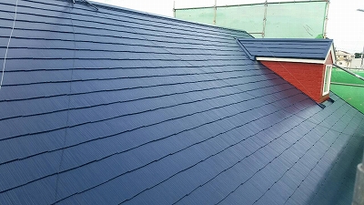 全体的に濃いスカイブルー色にきれいに仕上がりました。屋根材を塗装膜でコーティングするので、屋根の耐久性がぐっと上がりました。屋根は、雨風やほこりの汚れだけでなく、太陽の紫外線など、家の部位の中で一番劣化を受けやすい部分なので、普段目に見えない分、定期的なメンテナンスをおススメさせていただいております!