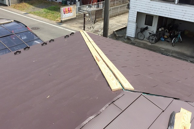 屋根の棟部分は、補強材として下地に新規で木材を設置してから、上から新しい板金を設置していきます。