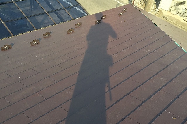 全体的に、屋根の色褪せに伴う屋根材の劣化が見受けられました。今回の屋根カバールーフ工事は、その名の通り、もともとある屋根の上から新しい屋根材を設置・固定する工事です。もともとある屋根を撤去しなくて済むので、廃材処分費がかからない他、撤去するよりも工期が少なくて済むので、お客様へのご負担も少なく、近年では弊社でもご依頼が増えている工事です。