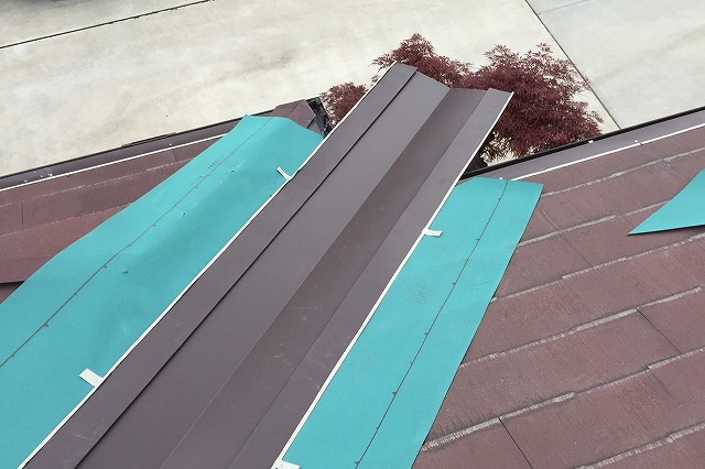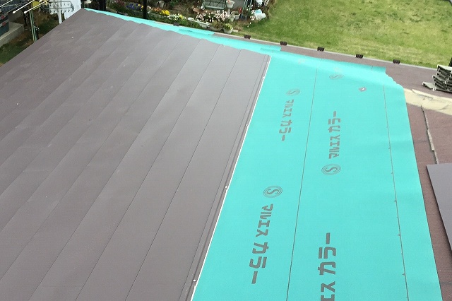 新しい屋根材を敷き詰める前に、「アスファルトルーフィング」という防水性のある素材を敷き詰めて行きます。画像は、屋根の谷になっている部分ですが、雨水が通りやすい所なので、必須です。緑色に見える素材がそうです。その上から、新しい屋根材を敷き詰めていきます。