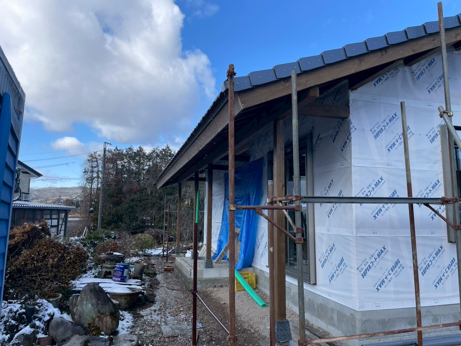 軒樋が設置されたあと、外壁工事が完了するまでの間はビニール製の仮竪樋を取り付けました。この仮設は新築現場ならではの処置で、工事中でも雨水が外壁や基礎に垂れないようにするためのものです。軽量ですが十分に役割を果たし、建物を濡れによる汚れから守る働きをしてくれました。