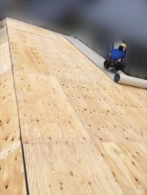 既存の傷んだルーフィングを撤去した後は野地板(12㎜構造用合板)を新しく張り替えました。