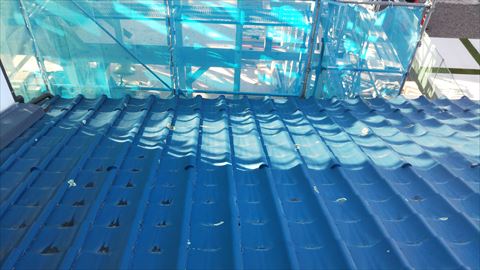 まずは現地調査、下見をしました。奥に見える青いシートが隣地に建つ新築住宅の足場にかけられたメッシュシートです。確かにかなり接近して建つようです。こちらの瓦屋根には雪止めのLアングルがあるのですが、雪止めの機能としては少々頼りないです。また、スノーエールの固定に使えればよかったのですが、軒先からの距離が近かったためそれもできません。スノーエールを置くとピッタリ納まってしまう距離です。