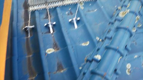 そこでLアングルのさらに上に後付けのウイングタイプの雪止めを取り付け、そこにスノーエールをステンレスの針金で縛って固定する方法を取りました。瓦を1枚剥がして垂木に後付け雪止めを固定して瓦を戻します。これを35カ所施工しました。左の写真のT字に見えるものが後付けのウィングタイプ雪止めです。