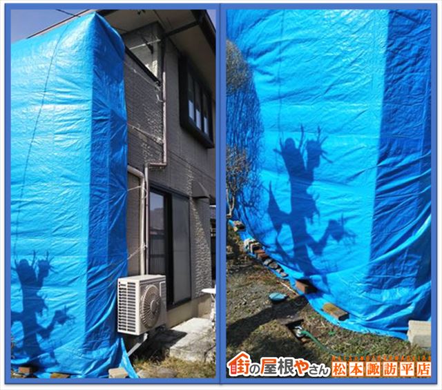 このまま放置すると再度の雨で被害が広がるため、ブルーシートで一時的に窓を覆い、雨養生を行いました。
