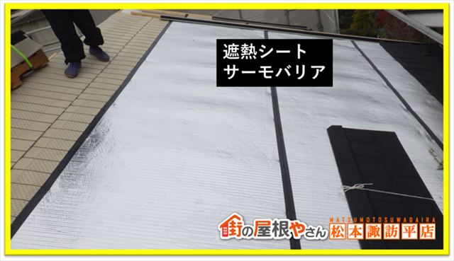 既存屋根は陶器瓦、特に大きな損傷はありませんでしたが、耐震性を上げたい、夏の暑さを何とかしたいというご希望で、軽量の天然石コーティングジンカリウム鋼板【メリッサ】への葺き替えをすることになりました。天然石の効果で断熱性も上がりますが、さらに効果を高めるために屋根材の下に遮熱シートを入れました。