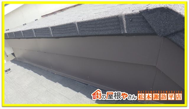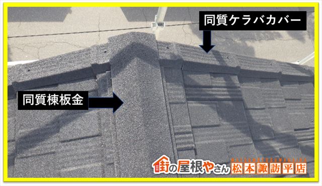 屋根の頂上の棟板金、斜めの部分の縁のケラバにそれぞれ屋根材と同じ天然石をコーティングした純正の板金を取り付けます。費用を抑えるためにガルバリウム鋼板を使うこともできますが、天然石のジンカリウム鋼板は塗装の必要がありませんが、ガルバリウムは15年~20年くらいで塗装のメンテナンスが必要です。同質のカバー類を使ったほうが後々お得です。