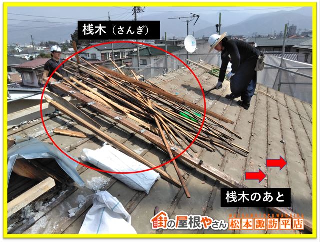 瓦は屋根に横方向に付けられている桟木(さんぎ)という角材に引っ掛けて止まっています。釘やビスは使っていません。賛否あるラバーロック工法(瓦のふちをコーキングで止める方法)を取っていない限り瓦自体は簡単に外せます。ただ、葺き替えるには桟木も撤去しなければならないのですが、桟木は釘で止まっているので外すのは一苦労です。釘が刺さっている細い角材なので処分するのも大変です。