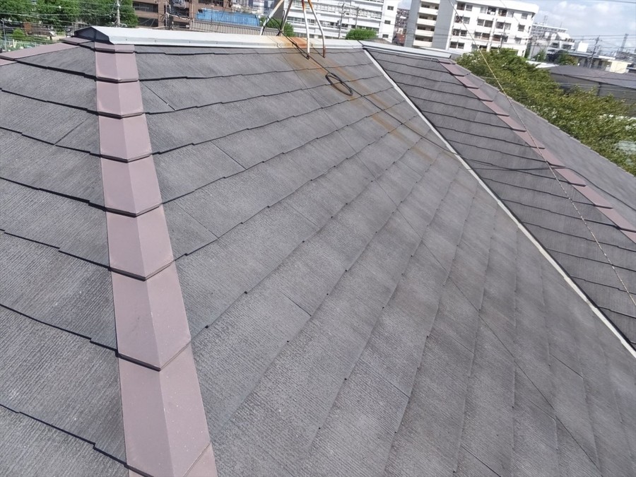 前回塗り替えをしてから10年程経ち、飛び込みの業者がよく来るようになった所、不安になり弊社にお問い合わせ頂きました。屋根の状態は全体的に褪色が進行しており、コケやカビも発生していました。カラーベスト自体には浮きやズレ、割れといった症状は出ていませんでしたので今回は塗装の提案をさせて頂きました。