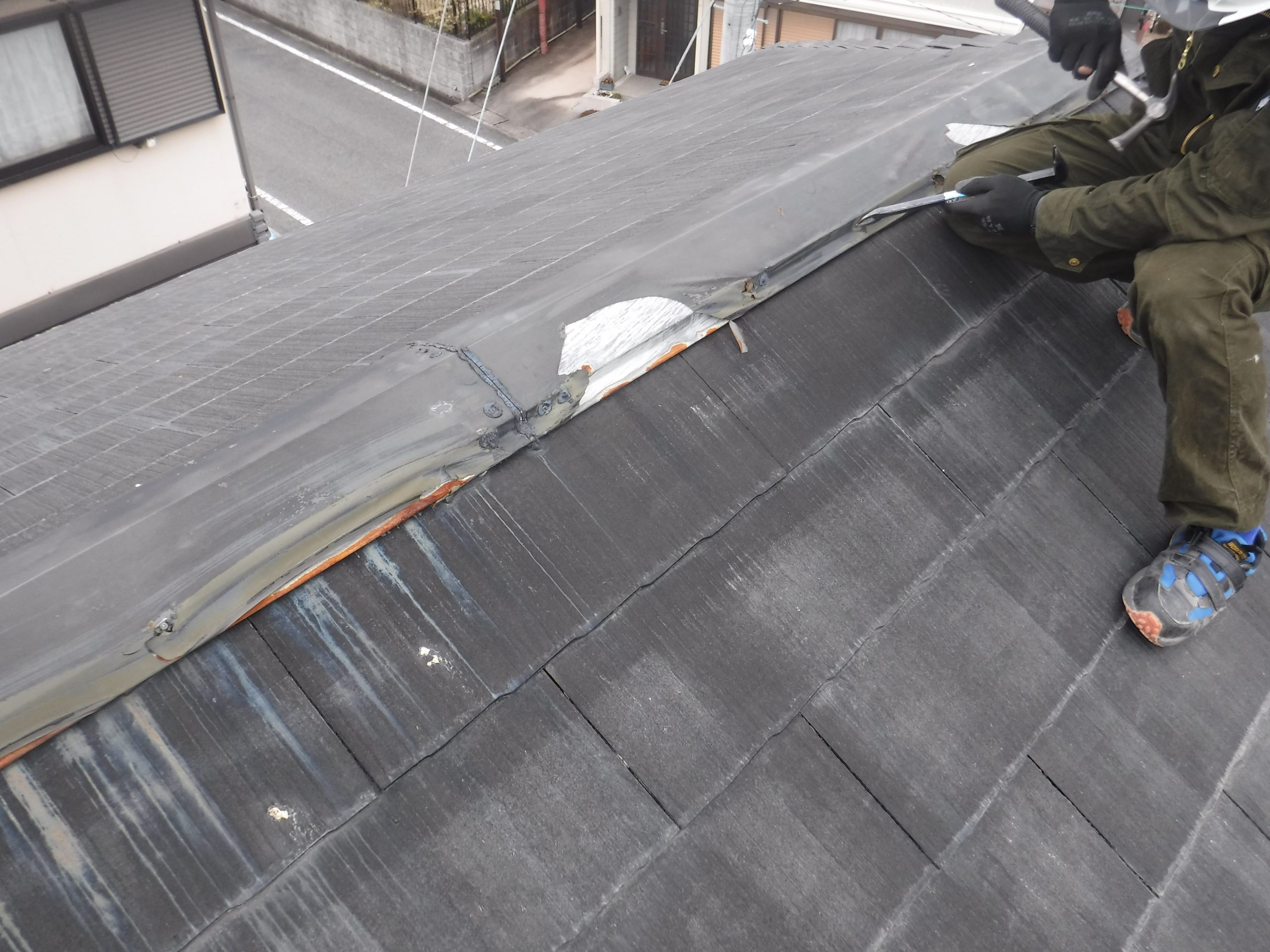雨水が入りやすくなる上、強風時には負荷が集中しやすいため、根本的な対策が必要です。屋根材自体の割れは見られませんでしたが、棟だけ明らかに老朽が進行している状態でした。