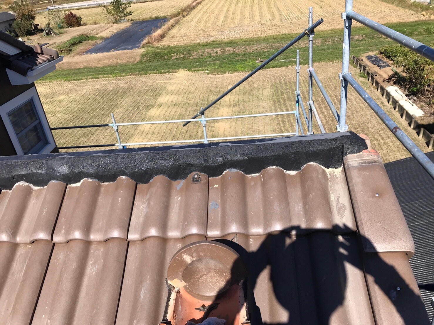 工事ではまず既存の棟瓦を慎重に取り外し、内部の漆喰と土台部分を確認する作業から始めました。