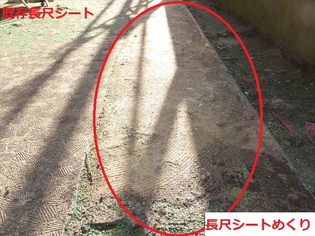長尺シートが膨れていた箇所にカッターで切れ目を入れました。切れ目を入れた瞬間に中から水が出てきました。