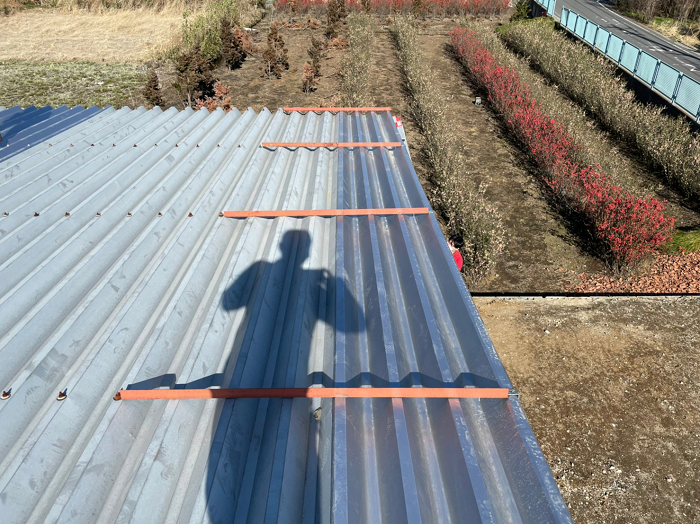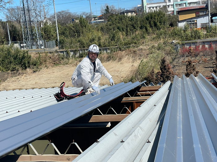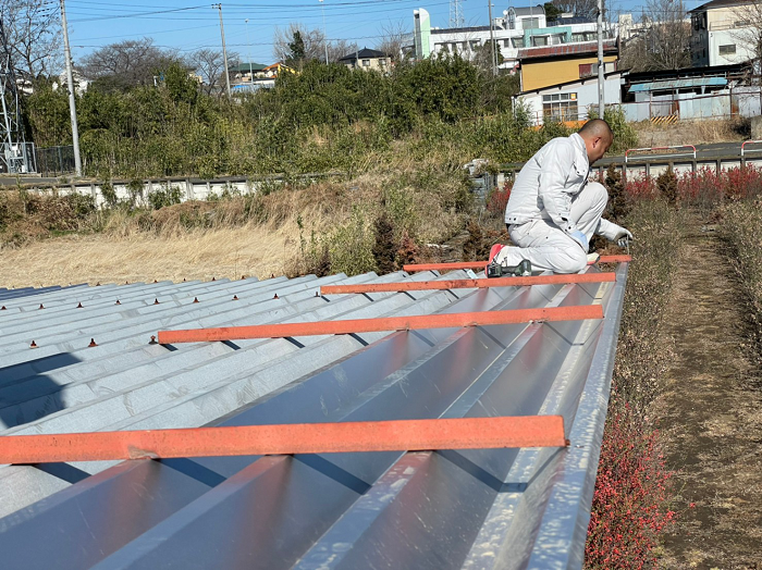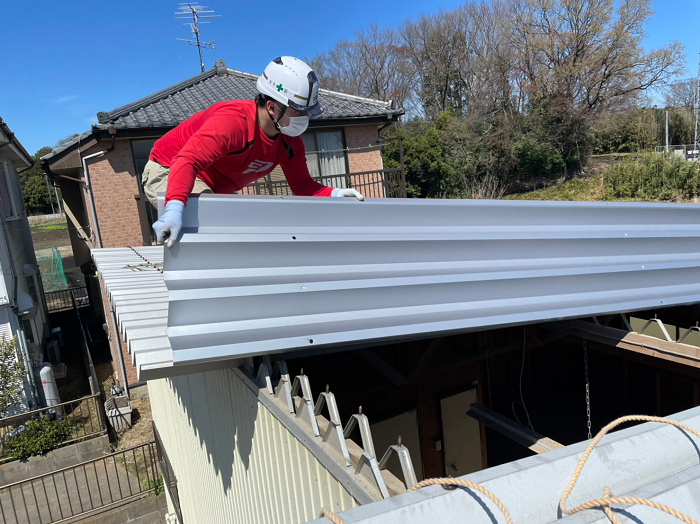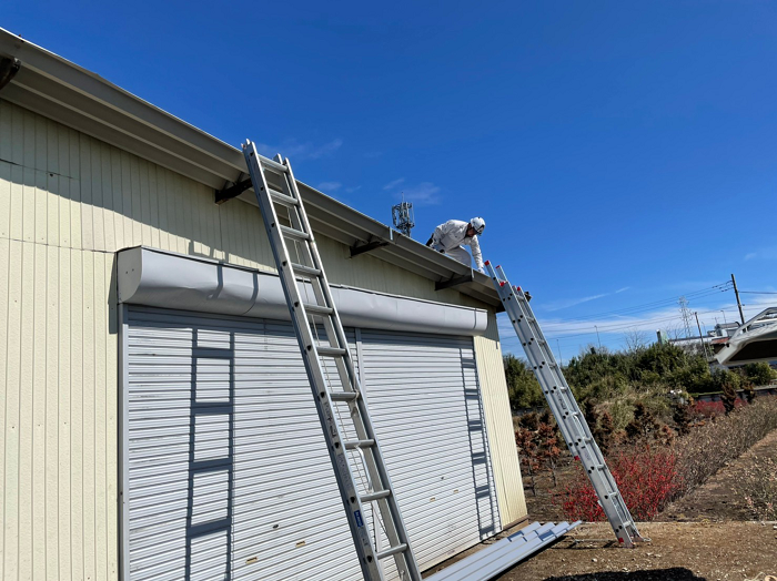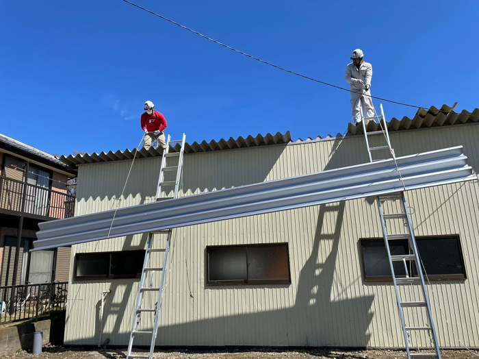 また、大規模な折版工事では大型重機(クレーン車)などを用いて屋根まで荷上げを行いますが、今回は本体3枚で、高さもそこまでなかったことから人力で荷上げを行いました。