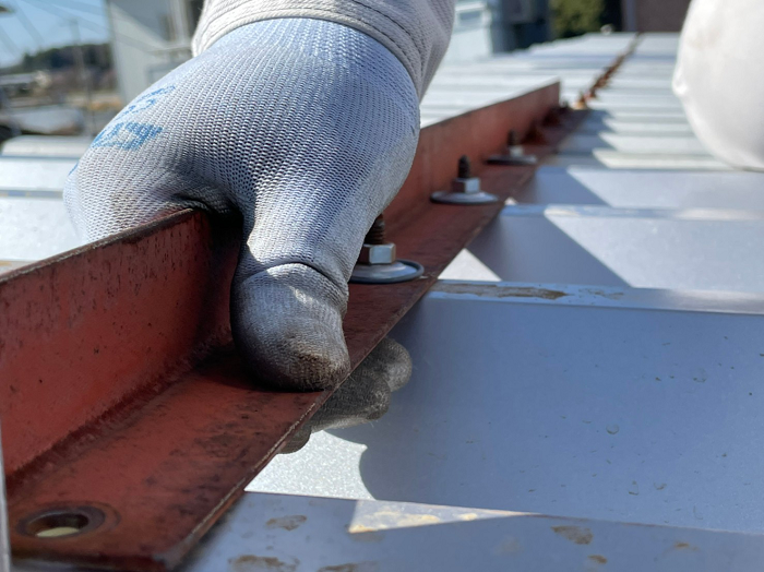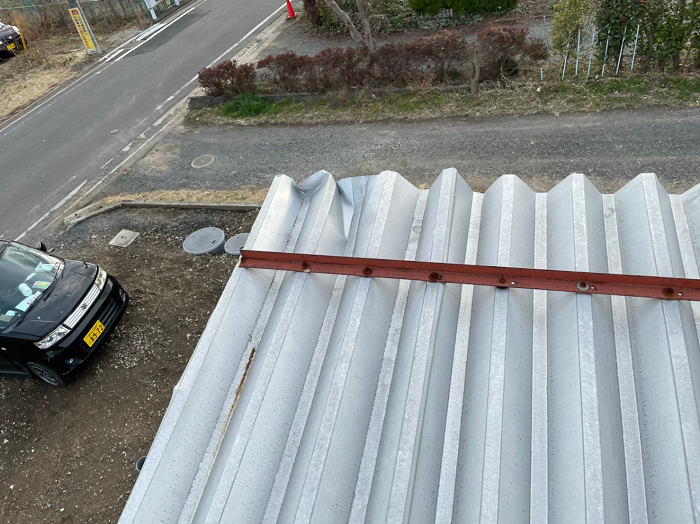 この補強材がある意味というのは、折半屋根の場合こういった端のほうがどうしても捲れやすくなっています。