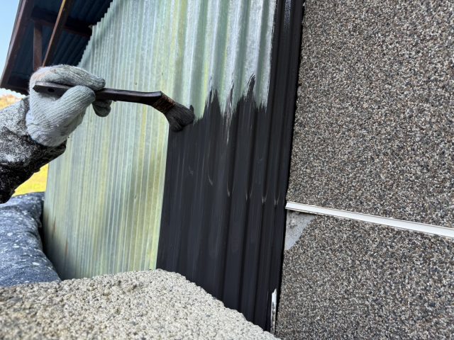 下塗り塗装を行います。使用した塗料は、アステックペイント社の『シャネツトップワンSi‐JY』という金属専用の塗料です。『シャネツトップワンSi‐JY』で塗装を行うと、通常は3回塗りで仕上げる塗装工程を、2回塗りで仕上げることが出来、工期短縮やコスト削減につながります。下塗り材として塗装すると防錆性と付着性を発揮します。