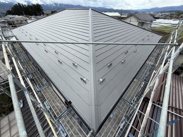 雨が降らない日を選び、天候に注意しながら、一気にエスジーエル鋼板を葺いていきます。ぴったりと重ねて、雨水が入り込まないように丁寧に仕上げていきます。長尺の横葺きタイプで仕上がった屋根は、見た目もスッキリとスタイリッシュで、昔ながらの瓦屋根とはまた違った魅力があります✨