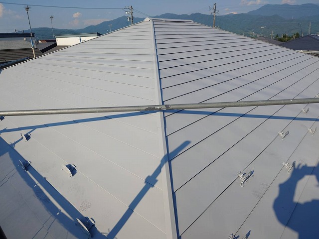 工事写真では、上塗りが終わった屋根が太陽光を受けて美しい光沢を放っているのがわかります。防水性と耐候性を高めるため、塗料の塗り重ねを丁寧に行い、屋根全体がしっかりと保護される状態に仕上げました。