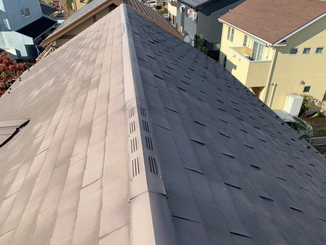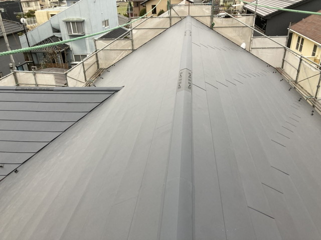 あとは軒先、ケラバ等の役物板金を取り付け、横暖ルーフSを本葺きし、棟板金を納めたら完了となります。