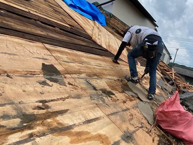 既存瓦・葺き土の撤去、瓦の下の劣化した野地板を確認・撤去