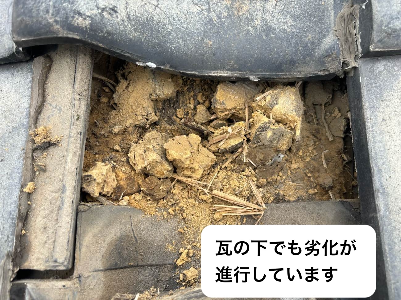 瓦を固定する「葺き土」がほとんど効いておらず、瓦がズレて落ちる危険あり