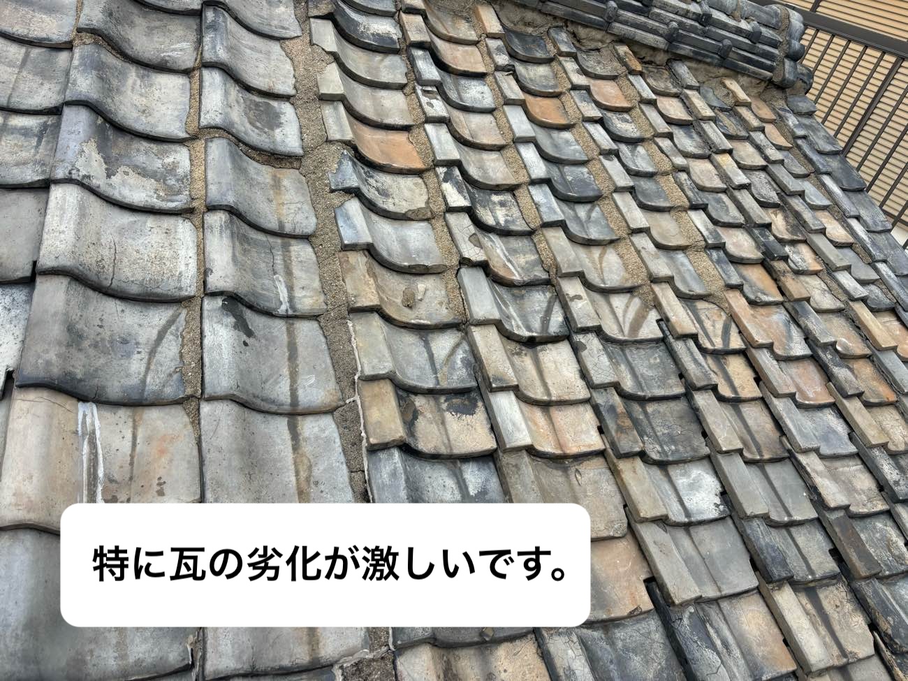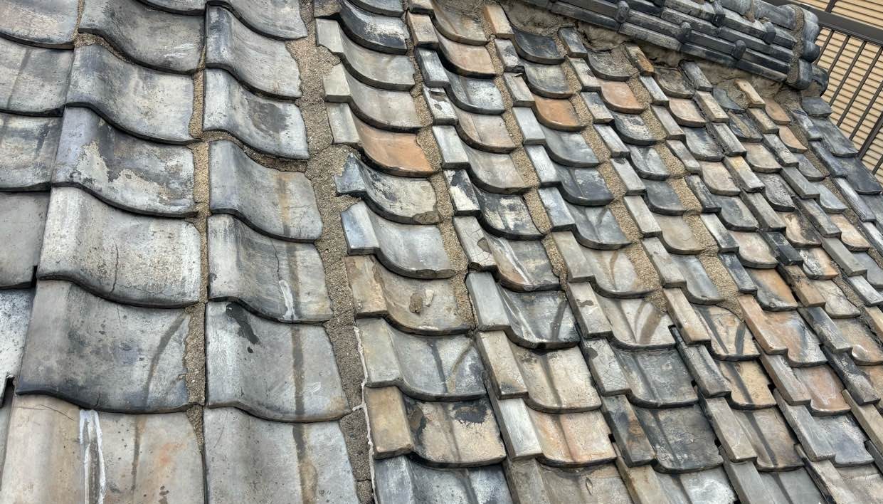 そんなお悩みから、お問い合わせをいただいた糟屋郡志免町の住宅。現地調査を実施すると、瓦の表面はすでに風化が進行し、固定力を失ってズレ・歪みが多数確認されました。