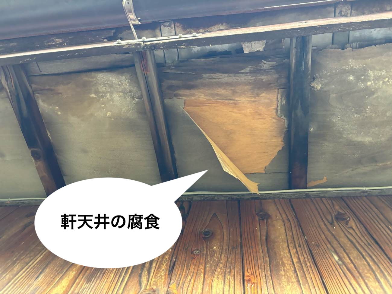 平棟や軒先も歪みや浮きが見られ、台風シーズンを前に心配な状態