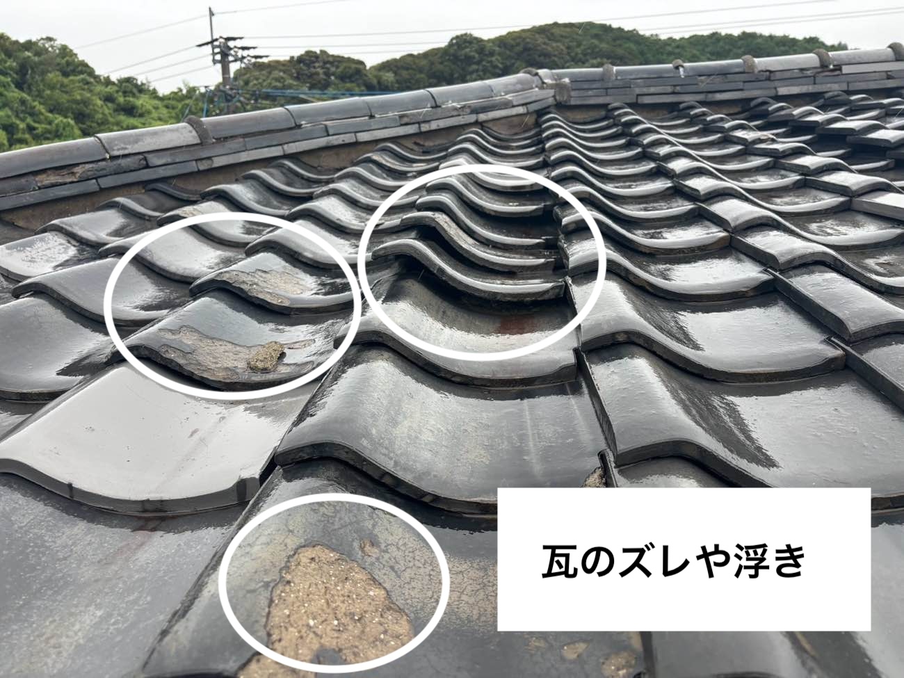 調査の結果、瓦屋根の広範囲にズレ・欠け・浮きが見られ、瓦の下にある防水シートや木材の下地が腐食している状態が確認されました。