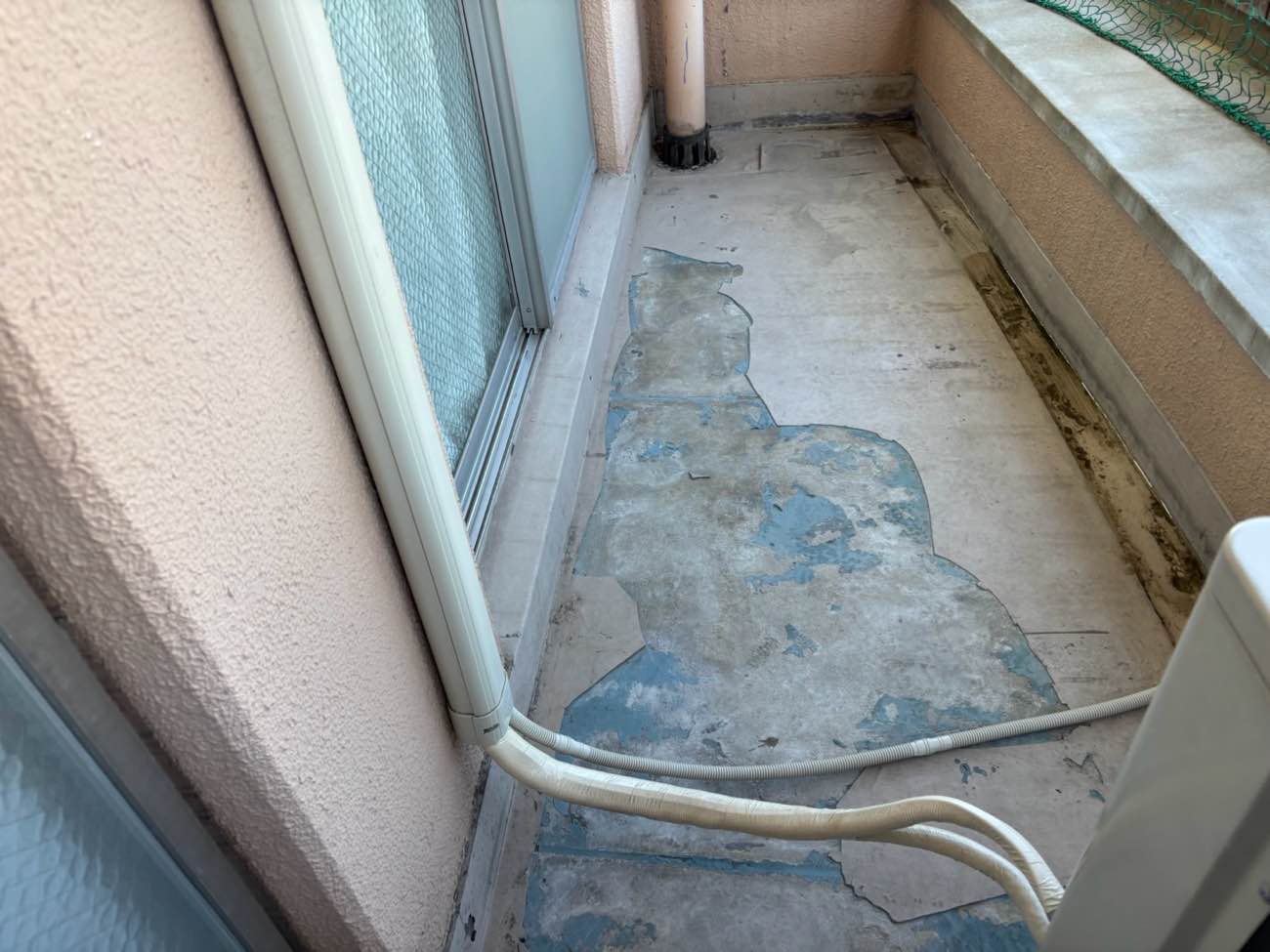ベランダの床を見ると、既存の防水層が広範囲にわたって剥がれている箇所が多数ありました。また、防水層がぷくっと膨らんでいる「ふくれ」という劣化症状も確認。これは、下地に浸み込んだ水分が日光で温められて水蒸気となり、防水層を押し上げている状態です。