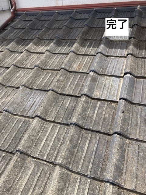 高圧洗浄などで苔を落とすことはできますが、瓦の表面が劣化して吸水性が高まっていると、すぐに再発します。重要なのは「苔があることで雨水の流れが止まっていないか」という点です。今回の工事では、水の流れを邪魔する苔を清掃した上で並べ直しました。