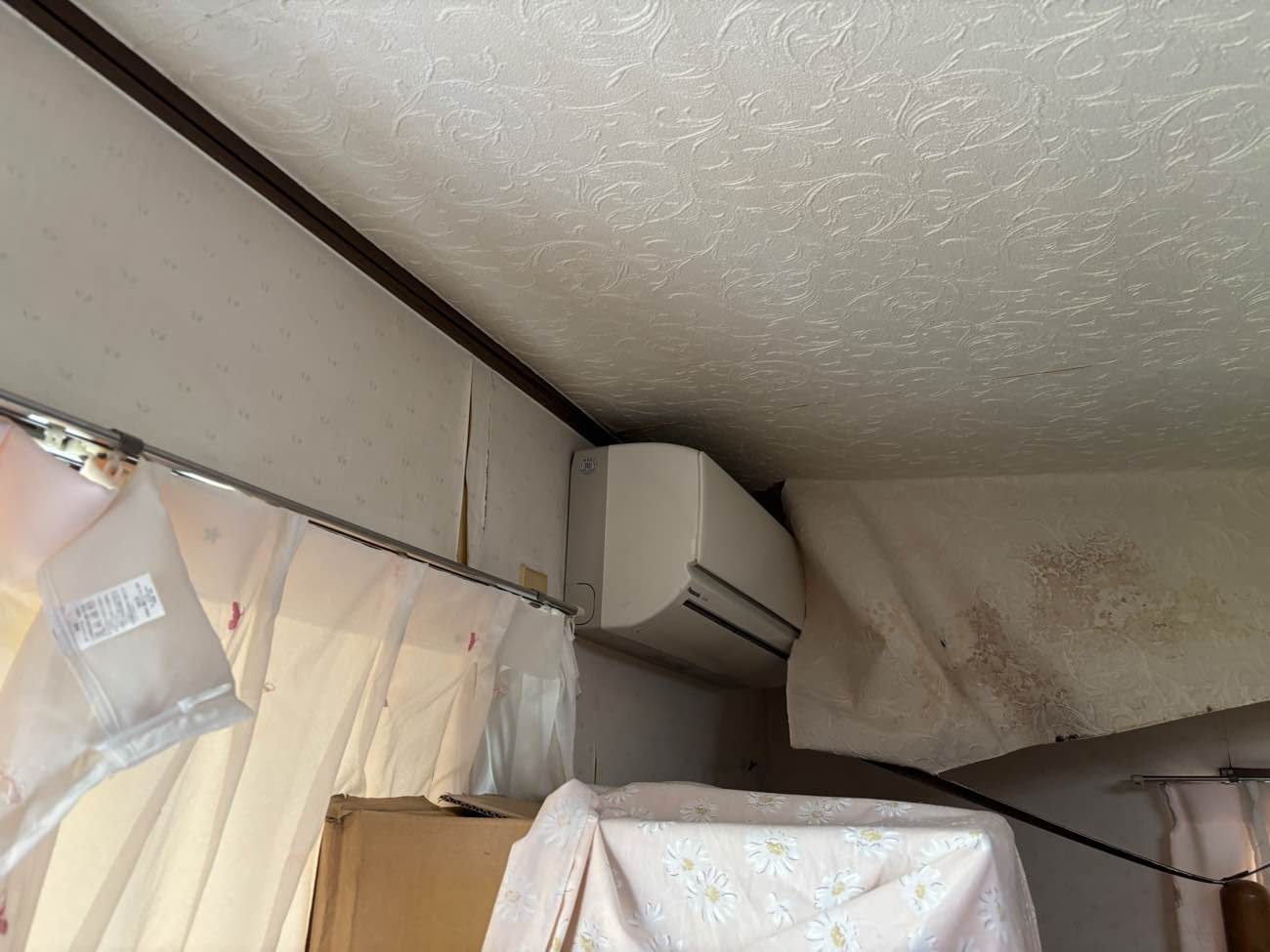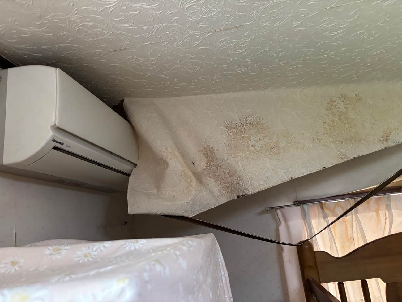 室内を見ると天井の壁紙が剥がれ、雨じみが発生していました。これは長期間に渡って雨水が建物内部へ侵入していたということになります。