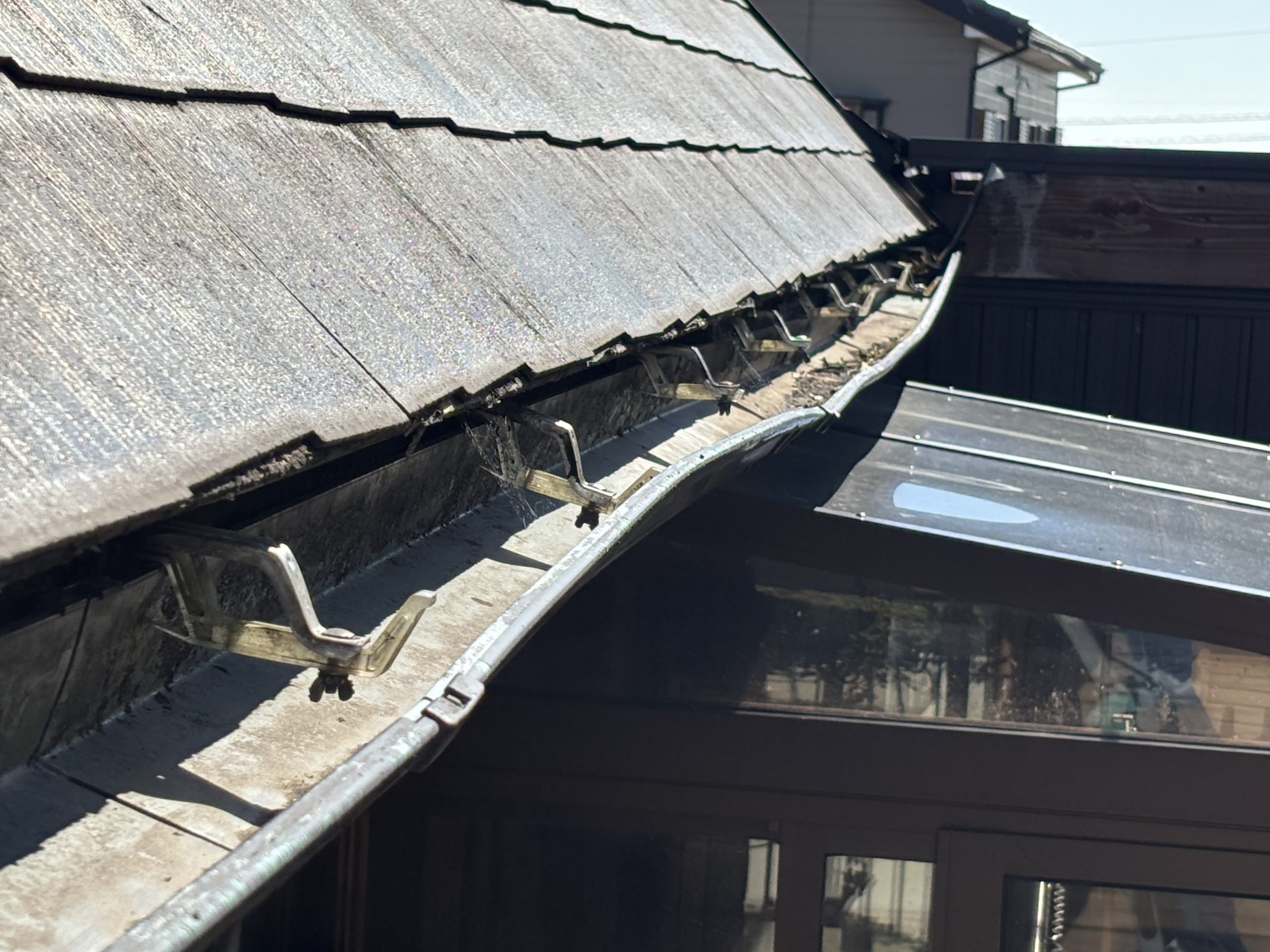 ・軒樋が全体にたわみ、水が溜まっている