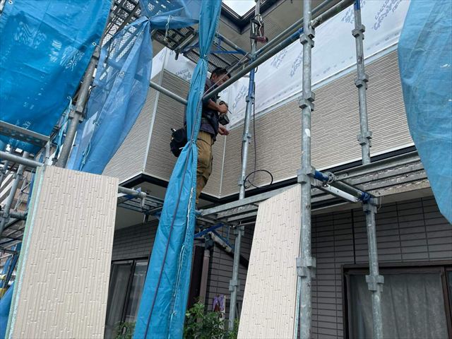 下地が完成した後、透湿防水シートを貼り、新しい外壁材を張ります。
