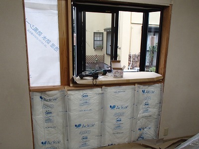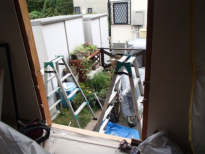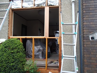 掃き出し窓が入る部分の外壁を取り壊し、枠を入れます。