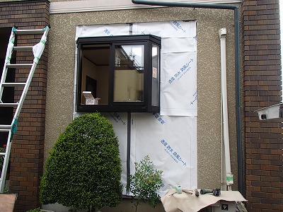 サッシをはめ込んだら防水シートを壁全体に貼ります。
