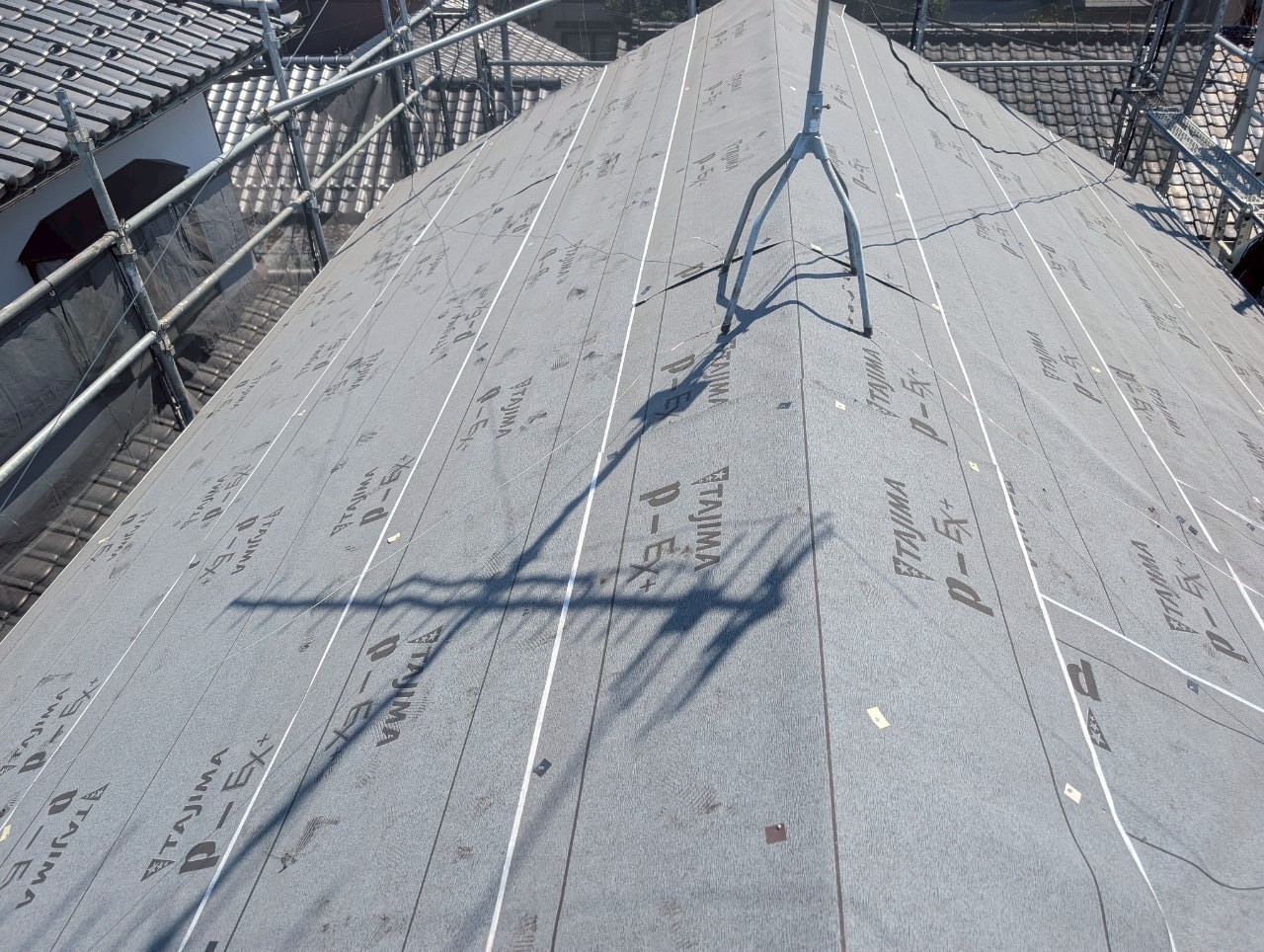 工事の最初の工程として、既存スレートの上からカバー工法を行うため、屋根全体に防水シートを敷設しました。写真では、TAJIMA製の防水シートが隙間なく施工されており、職人が細かい部分まで丁寧に張り込んでいる様子が伝わります。この防水シートは、屋根の寿命を左右する大切な工程であり、緊張感を持ちながら行われる作業です。屋根の谷部分も綺麗に収まり、雨水の流れがスムーズになるよう工夫されています。