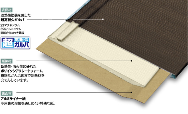 断熱材一体型: 屋根材の裏側に「ポリイソシアヌレートフォーム」という強力な断熱材が詰まっています。これにより、夏の2階の暑さを大幅に軽減します。