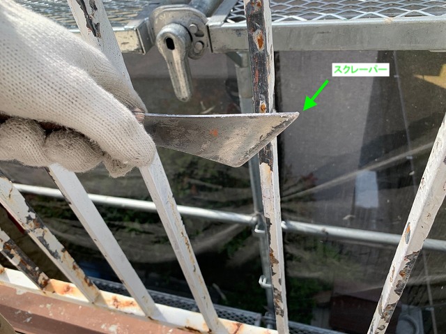 ケレンタワシでは落とせない部分は、スクレーパー(へら)を用いて古い塗料やサビを落とします。