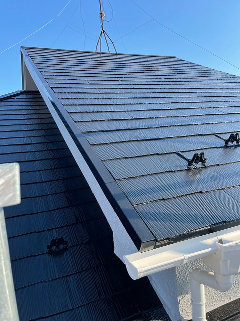 上塗りを終えると、このように仕上がります。青空の下で、まるで新築のような輝きを取り戻しています♪