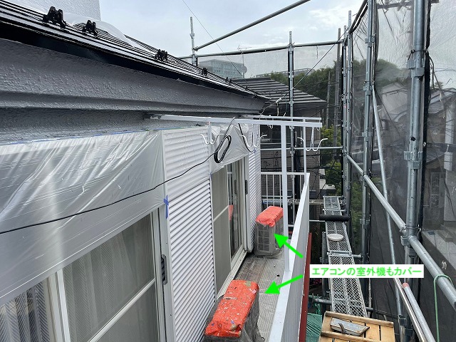また、塗料が付着してはいけない、エアコンの室外機や自動車、あるいは花壇などには、さらにビニールシートなどを被せてカバーしているんです。ちなみに、このカバーを養生(ようじょう)と呼んでいます。