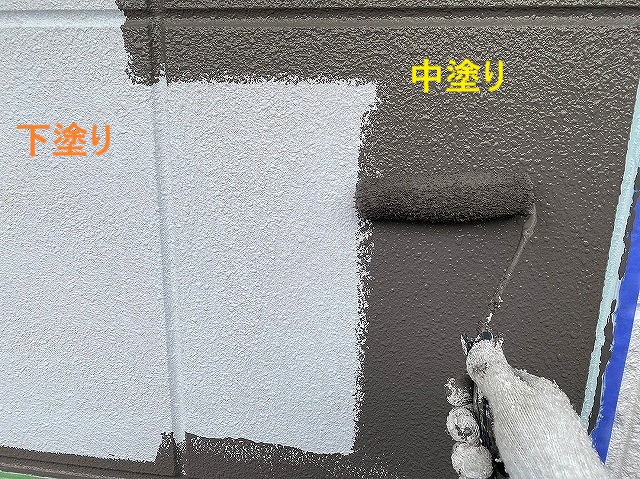 屋根塗装と同様に、外壁塗装も「下塗り➡中塗り➡上塗りの三回塗り」で仕上げます。