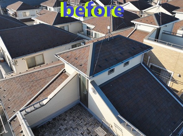 アスファルトシングルの屋根は、長年の紫外線や雨風の影響で少しずつ色があせ、表面の防水機能も弱まってきていました。