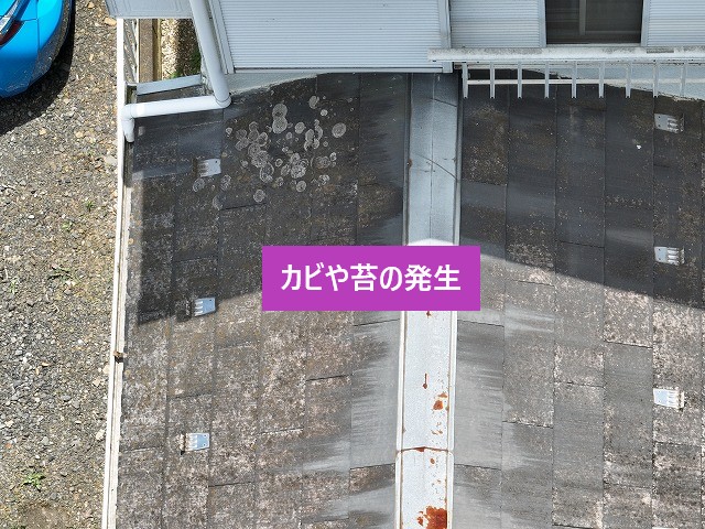が広がっており、スレート表面の塗膜はほとんど残っていない状態です。