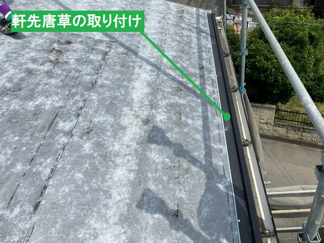 前出の軒先唐草もこのケラバ板金も、端から雨水を浸水させない・雨水をスムースに屋根から排水・小口を隠し美観を向上させる、など沢山に意味を持っている大切な屋根の部位です。