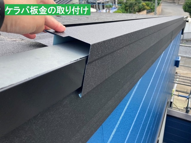 これは、屋根の端部分であるケラバに板金をカバーしている場面です。