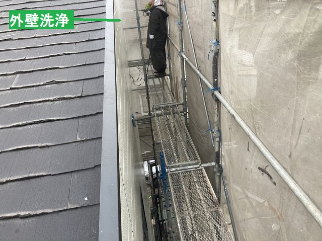 外壁を塗装する前に、高圧な洗浄機で外壁の下地の状態を整えます。