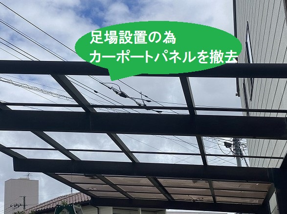 足場設置の際に緩衝するので、カーポートパネルは一時撤去しました。
