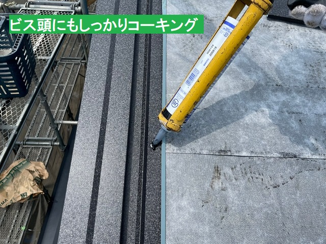この様な箇所は、雨漏り原因となり易いので、全てのビス頭にもコーキング処理を施し、万全の漏水対策を行うのが当店の決まりです。