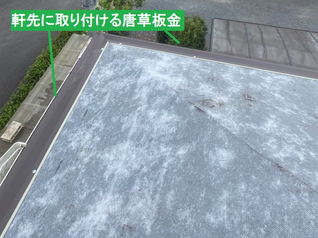 この軒先唐草板金は、屋根の傾斜を伝ってきた雨水を正常に雨樋に落とす役割を担っており、軒先唐草が正常に取り付けられていないと、雨水が木部に伝わってしまうのでとても大切です。