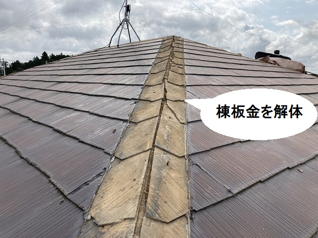 今の屋根に重ね葺く場合も、屋根の曲がり角を覆う棟板金だけは解体します。