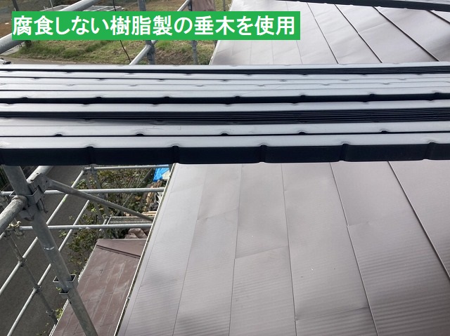 棟板金の下地材には、万が一の漏水でも腐食しない樹脂製垂木を使用しました。